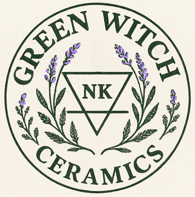 Nicole hand-builds small ceramic creatures and fairy-garden pieces — frogs in straw hats, speckled toadstools, honeycomb morels — from a little green studio in Kentucky.