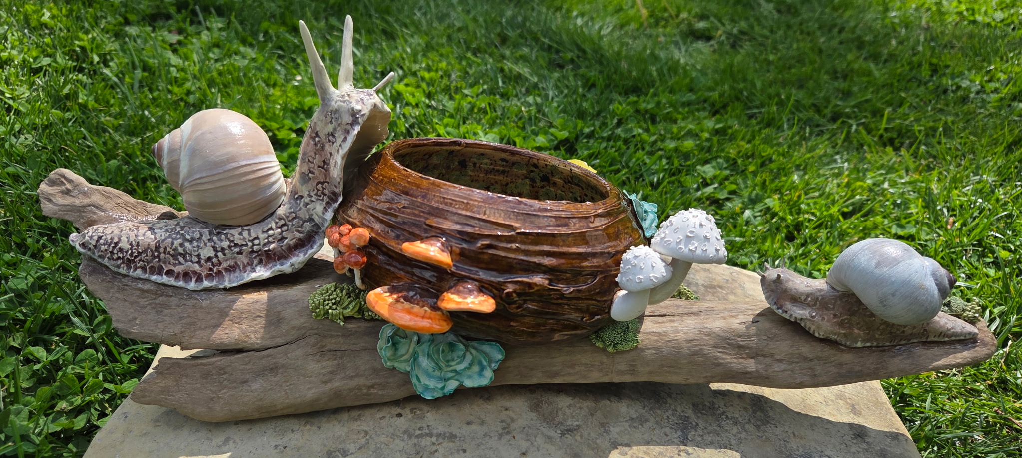 ← All work Snail & Log Garden Fairy Garden Exhibition — not for sale Show piece. Not currently for sale — one for the studio. Dimensions12" driftwood base · 4-5" pieces Materialsstoneware · underglaze · driftwood MadeApril 2026